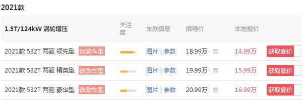 根据上方图片我们可以十分清楚的看见这三款车型的价格以及车型款式的基本信息。其中关注度最高的2021款532T两驱领先型,全系搭载了1.5T直列四缸涡轮增压发动机,最大输出功率124kw,最大扭矩250n.m,配以7挡双离合变速器。