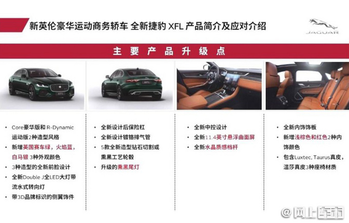 内饰方面,新车配备了11.4英寸中控屏+12.3英寸液晶仪表的组合,增加了整体的科技感。座椅有三种真皮材料可供选择,车内还装配Meridian™音响系统以及主动降噪功能。动力方面可参考现款捷豹XFL,搭载不同功率的2.0T发动机,最大功率分别是147kW,184kW,221kW,峰值扭矩分别是320N·m,365N·m,400N·m,匹配8速手自一体变速箱。