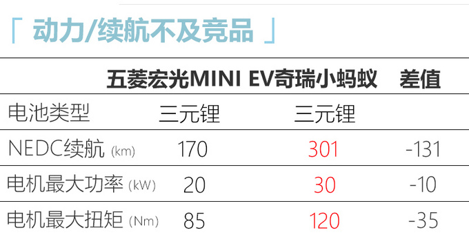 从车型定位来看,五菱宏光MINI EV最大竞争对手为奇瑞小蚂蚁,奇瑞小蚂蚁提供2座和4座版本,可选择性更多。奇瑞小蚂蚁最高车速100km/h,NEDC综合续航里程为301km,0-50km/h加速时间为6秒。