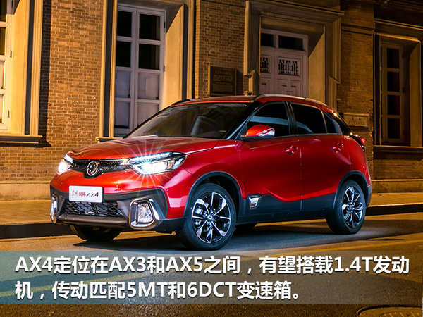 此前东风风神已经发布了全新SUV AX4的官图,实车将在车展期间正式发布,预计9月份上市销售。AX4是针对年轻消费群体打造的一款小型SUV,定位在AX3和AX5之间。新车基于DF1平台打造,有望搭载东风自主研发的1.4T发动机,传动系统匹配5速手动和6速双离合变速箱,上市后将与长安CS35、哈弗H2等车型展开竞争。
