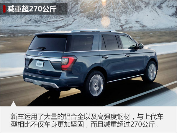全新福特Expedition运用了大量的铝合金以及高强度钢材,与上代车型相比不仅车身更加坚固,而且整车减重约为270公斤,对车辆的操控性以及燃油经济性有着不小提升。新车的外观多采用直线勾勒而成,显得非常粗犷。此外,大面积的网状镀铬进气格栅,厚重的车头造型、以及大尺寸多辐条合金轮毂,均有着很浓的美式风格。