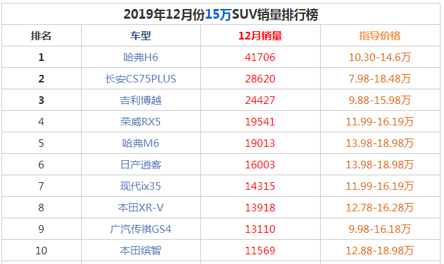 2019年12月15万SUV销量排行榜前十名