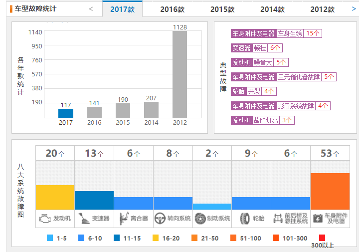 从他的故障类型中看,2017款车型的117个故障大部分都是车身附件及电器的问题,大家都很清楚,车身附件及电器的问题都是一些小问题都很好解决的,所以可以看出长城cs35质量是很不错的。