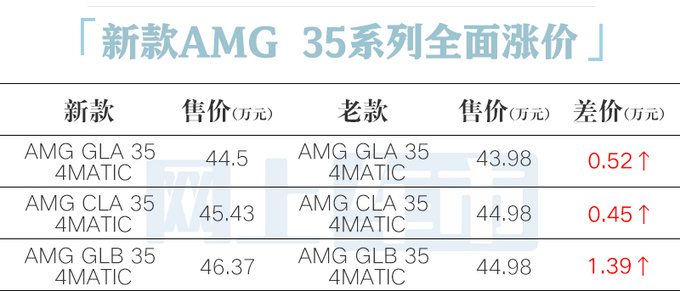 11月17日,梅赛德斯-AMG家族8款性能车在广州车展亮相并正式上市,新款AMG GLA 35 4MATIC官方售价为44.5万元;AMG GLB 35 4MATIC官方售价为46.37万元;AMG CLA 35 4MATIC官方售价为45.43万元。