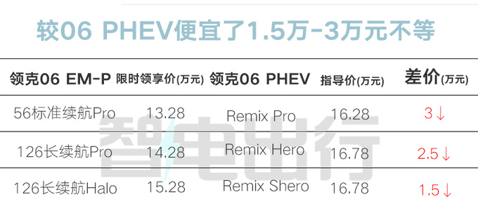 即日起至2023年12月31日(含当天)前下订购领克06 EM-P并完成大定锁单,全系车型享4000元领享金,限时领享价区间为13.28万-15.28万元,起售价较领克06 PHEV降低3万元。