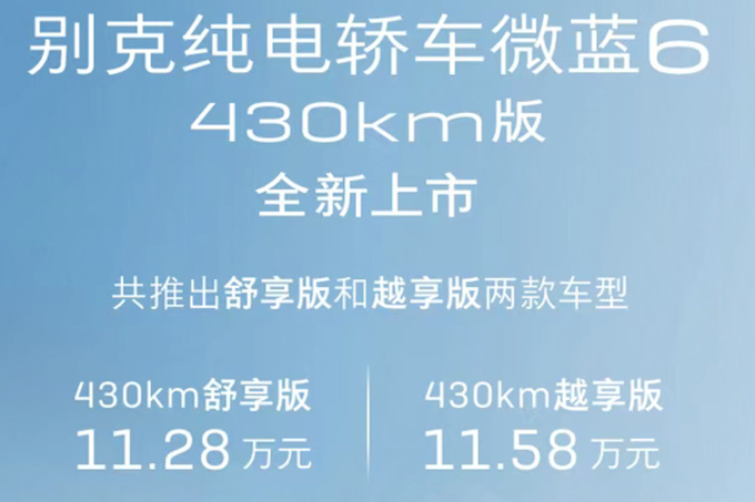 8月25日,别克新微蓝6纯电 430km版正式上市,2款车型官方指导价为11.28万元-11.58万元,相比老款518km版售价最高下调8.11万元。新车最大的变化是将老款使用的三元锂电池调整为磷酸铁锂电池,较老款容量更小,CLTC工况续航里程也降至430km。