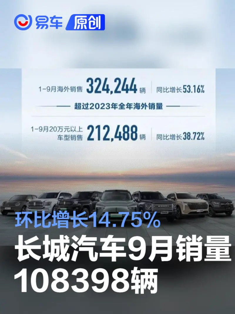 易车讯 近日,长城汽车公布了9月销量。据悉,9月销量达到108398辆,环比增长14.75%。据悉,长城汽车1-9月新能源销售211492辆,同比增长24.15%。1-9月海外销售324244辆,同比增长53.16%。1-9月20万元以上车型销售212488辆,同比增长38.72%。