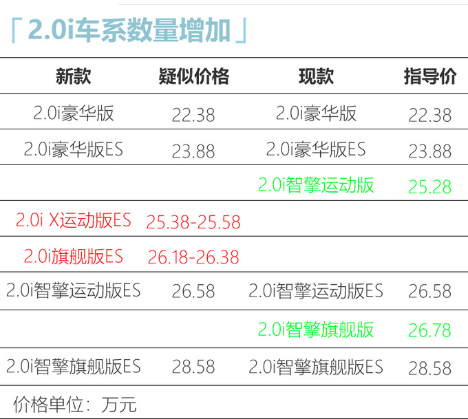 此次新增的2.0i X-BREAK运动版ES相比2.0i豪华版ES增加了以下配置,包括前方影像监测、侧方影像监测、LED雾灯、驾驶员监测系统、X-MODE、后排空调出风口、副驾驶席8向电动调节、座椅加热等多项配置。综合该车型疑似的售价来看(25.38-25.58万元),比2.0i豪华版ES贵出不到2万元,但却多出了10余项配置以及更运动的外观套件,整体性价比非常高。