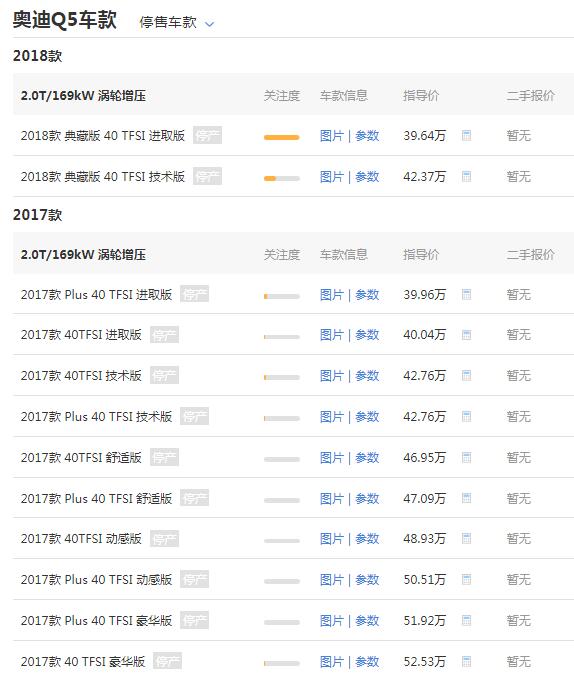 从上图我们可以看到,目前奥迪q5已经停售,距离现在最新的车型为奥迪Q5,2018款典藏版40TFSIquattro进取型和奥迪Q5,2018款典藏版40TFSIquattro技术型,其官方指导价分别为39.64万和42.37万。