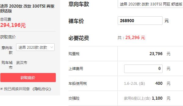 我们以途昂2020款改款330TSI两驱舒适版为例,该车型目前优惠之后的裸车价为268900元,购置税为23796元,车船税为400元,强险费用为1100元,落地价合计为294196元,如果是贷款购买,我们以首付3成,贷款3年来进行计算,首付金额为105996元,月供金额为5760元。