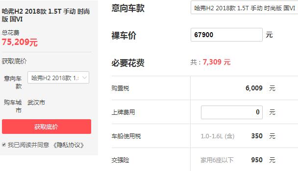 我们以哈弗H2,2018款1.5T手动两驱时尚型为例,该车型目前的裸车价为67900元,购置税为6009元,车船税为350元,强险费用为950元,落地价合计为75209元,如果是贷款购买,我们以首付3成,贷款3年来进行计算,首付金额为27679元,月供金额为1455元。