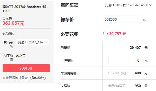 我们以奥迪TT2017款,Roadster45TFSI为例,该车型目前的裸车价为332300元,购置税为29407元,车船税为400元,强险费用为950元,落地价合计为363057元,如果是贷款购买,我们以首付3成,贷款3年来进行计算,首付金额为130447元,月供金额为7119元。