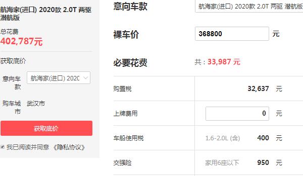 我们以航海家(进口),2020款2.0T两驱潜航版为例,该车型目前的裸车价为368800元,购置税为32637元,车船税为400元,强险费用为950元,落地价合计为402787元,如果是贷款购买,我们以首付3成,贷款3年来进行计算,首付金额为144627元,月供金额为7901元。