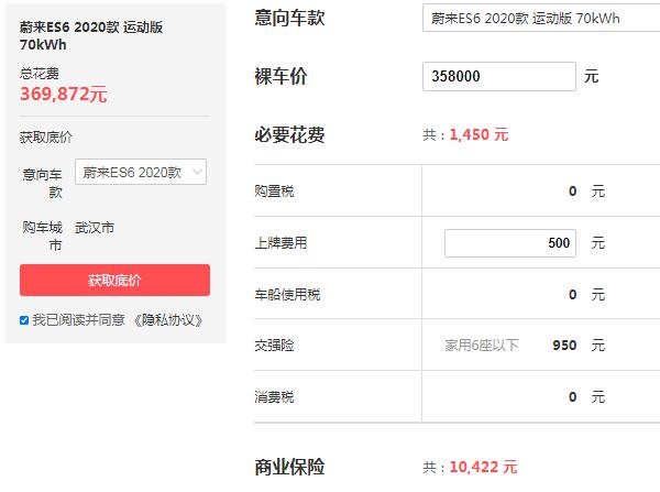 从上方图中我们可以十分清楚的看见蔚来es6落地价多少钱的详细内容。这款车型的裸车价格为35.8万元,花费上牌费用500元,交强险950元,商业保险10422元,最终算出蔚来es6的最低落地价为36.98万元。