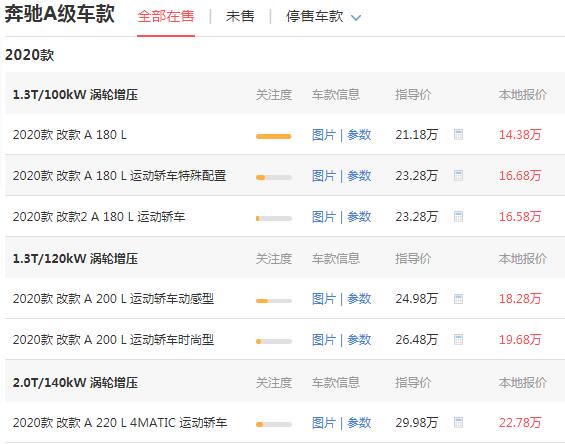 从上图我们可以看到,目前奔驰A级在售车型一共有6款车型,其官方指导价在21.18-29.98万之间,而目前北京地区优惠之后的裸车价在14.38-29.98万之间。