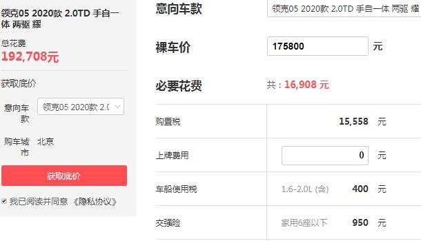 我们以领克05,2020款2.0TD两驱耀型为例,该车型目前的裸车价为175800元,购置税为15558元,车船税为400元,强险费用为950元,落地价合计为192708元,如果是贷款购买,我们以首付3成,贷款3年来进行计算,首付金额为69648元,月供金额为3766元。