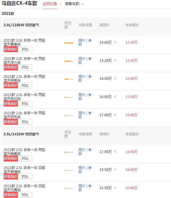 从上图我们可以看到,目前马自达cx4在售车型一共有8款,其厂商指导价在14.88-21.58万之间。