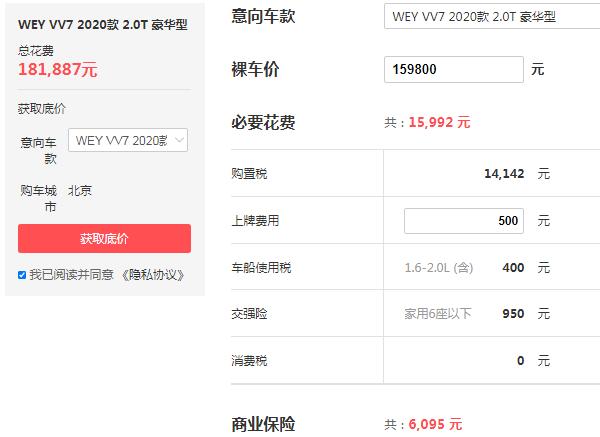 上面我们已经知道长城vv7多少钱了,下面我们根据长城vv7裸车价15.98万元可以计算出该款车型的落地价格。如上图所示,花费购置税14142元,上牌费用500元,车船使用税400元,交强险950元,以及必要的商业保险6095元,最终得出长城vv7的落地价格为18.18万元。