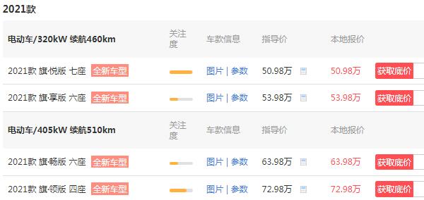 从最新的消息得出红旗hs9新款2020价格并没有找到,红旗hs9这款车型最新款为2021款,共有4款在售车型。下图为红旗hs9新款2021价格的详细内容,可以看到红旗hs9的指导价格为50.98-72.98万元,最便宜的裸车价格为50.98万元。