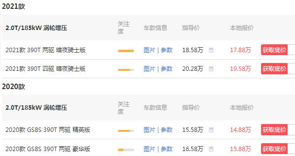 2021最新款传祺gs8拥有两款在售车型,两款车型均采用了7座布局设计,其指导价格为18.58-20.28万元。下图为传祺gs8七座报价及参数的详细内容,可以看出最新款在售的两款车型均有降价优惠活动,其中两驱暗夜骑士版优惠后的裸车价格为17.88万元。