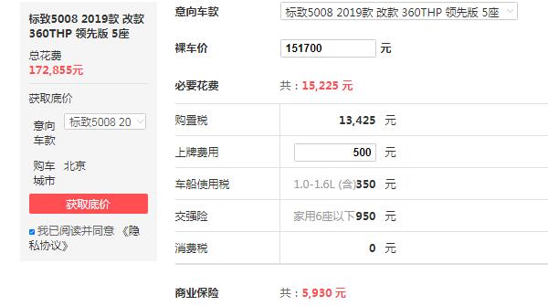 根据优惠后的标致5008裸车价,我们可以计算出该车型的落地价格。以裸车价为15.17万元计算,花费购置税13425元,上牌费用500元,车船使用税350元,交强险950元,以及必要的商业保险费用5930元,最终得出标致5008的落地价格为17.28万元。