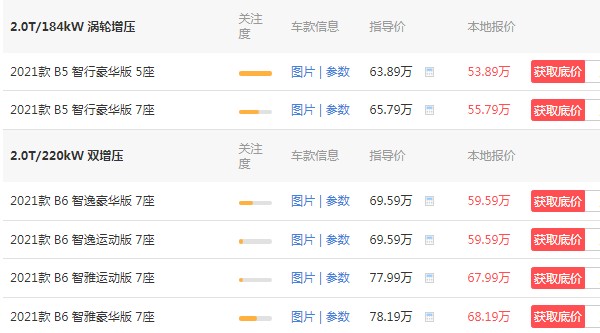 2021最新款沃尔沃xc90共有六款在售车型,其指导价格为63.89-78.19万元,下图为沃尔沃xc90最新款所有在售车型及价格的详细内容。可以看到每款车型的优惠力度都是比较大的,其中沃尔沃xc90智行豪华版5座关注度最高,该车型的优惠裸车价格为53.89万元。