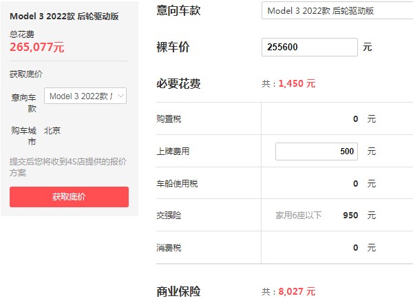 根据上面讲述特斯拉Model3的落地价格,我们可以计算出该车型相应的落地价格。以裸车价格为25.56万元计算,花费上牌费用500元,交强险950元,以及商业保险费用8027元,最终得出特斯拉Model3落地价为26.5万元。