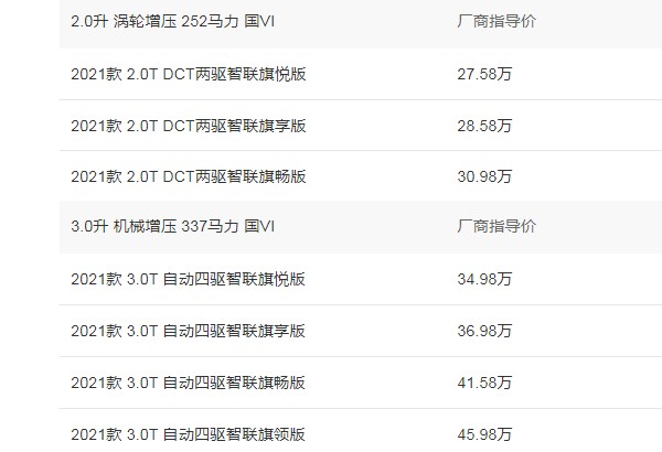 我们继续来看看红旗hs7 2021款的报价,上图为2021款红旗hs7所有车型及报价详细。该车型的指导价格为27.58-45.98万元。可以看到2021款的红旗hs7和2022款的红旗hs7价格是一样的,所有十分推荐购买2022款新款红旗hs7。