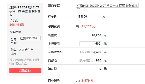 红旗HS5全款落地20.82万元