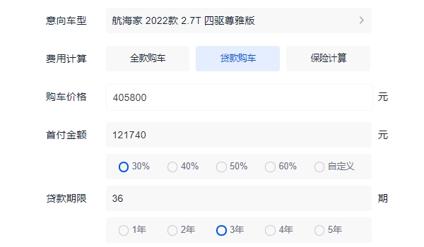 通过以上内容已经知道2022款林肯航海家的裸车价格,根据裸车价格可以计算出分期首付价格,贷款首付30%,缴纳购买车辆的必要花费(39282元)和商业保险(11295元),可以计算出分期首付需要17.23万元。