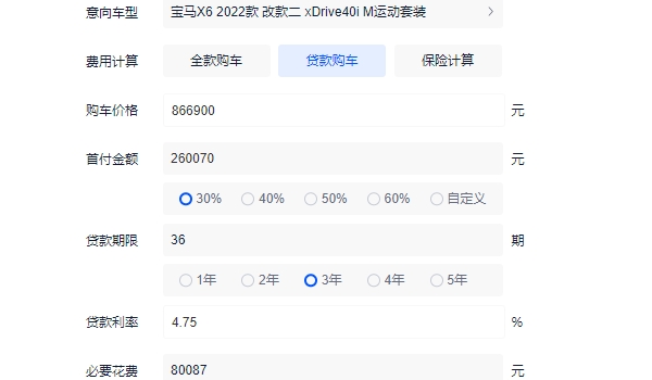 宝马X6裸车价格是86.69万元,车辆价格相对比较高,购买车辆时可以选择分期购买,这样可以减缓压力,分期时需要交纳30%的车辆首付,需要交纳购车必要花费以及购买车辆的商业保险,分期首付合计的金额为36.14万元。