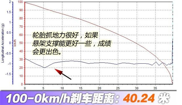 制动测试时,迅速地将刹车踏板一踩到底,这种情况下制动力的释放还是比较均匀的,刹车力道比较足,全程都维持在-1g左右,连续10次制动测试成绩都比较稳定,刹车系统热衰减现象不明显。