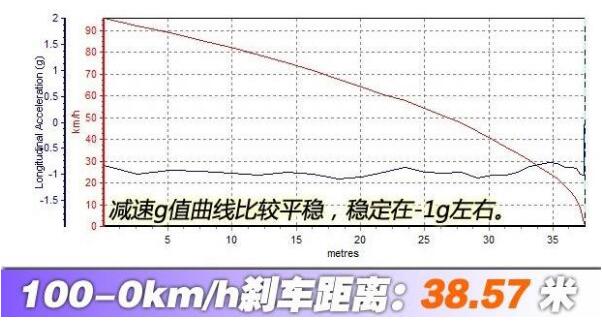 本田UR-V刹车怎么样,从上面的图中可以看到本田URV从100-0km/h刹停的距离是38.57米,本田URV的刹车力度很足,驾驶者可以在很短的距离刹住,刹车给人信心。UR-V的制动总泵调校也偏向舒适,更像是豪华的商务车型。