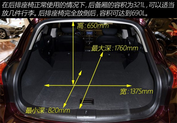 英菲尼迪QX50后备箱尺寸进深为820-1760mm,宽度1375mm,高650mm,在后排座椅正常使用的情况下,后备箱的容积为321升,可以放几个旅行箱,座椅完全放倒之后,容积可达690升。